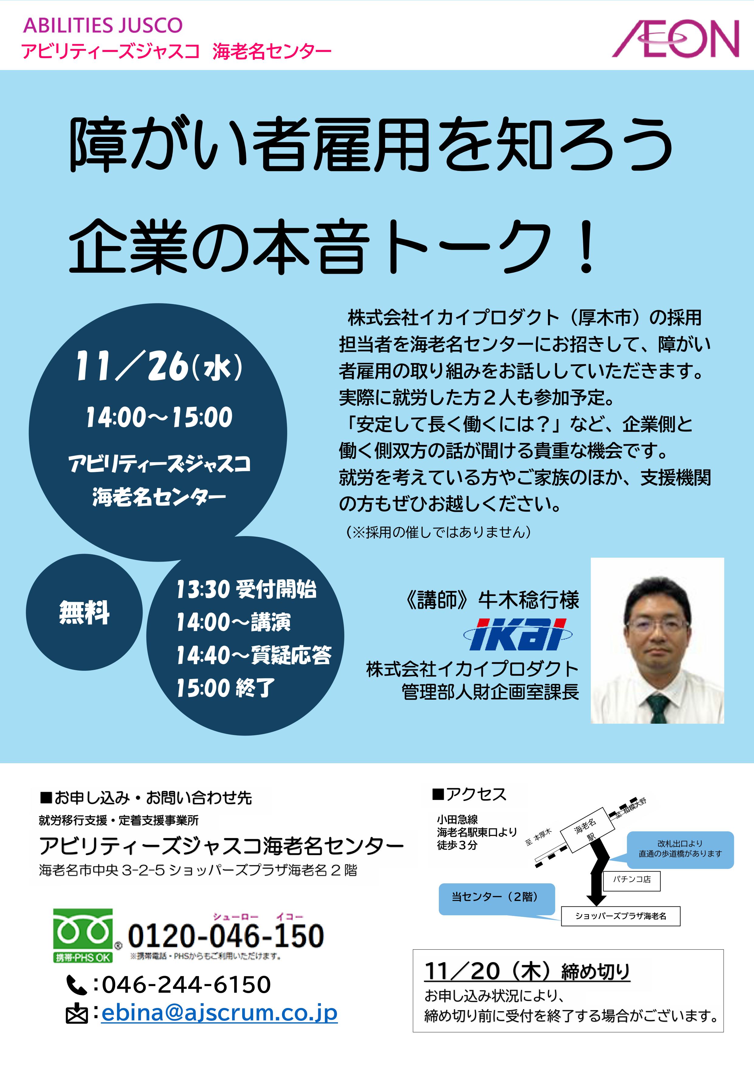 障がい者雇用をされている企業の方をお招きして実際の現場のお話をしていただきます。 また、今回のイベントは企業側のお話だけではなく、就労されている当事者の方にもご参加いただきます。 双方の意見を知っていただく事で、より障がい者雇用についてご理解いただける貴重な機会となっております。 是非ともご参加ください。