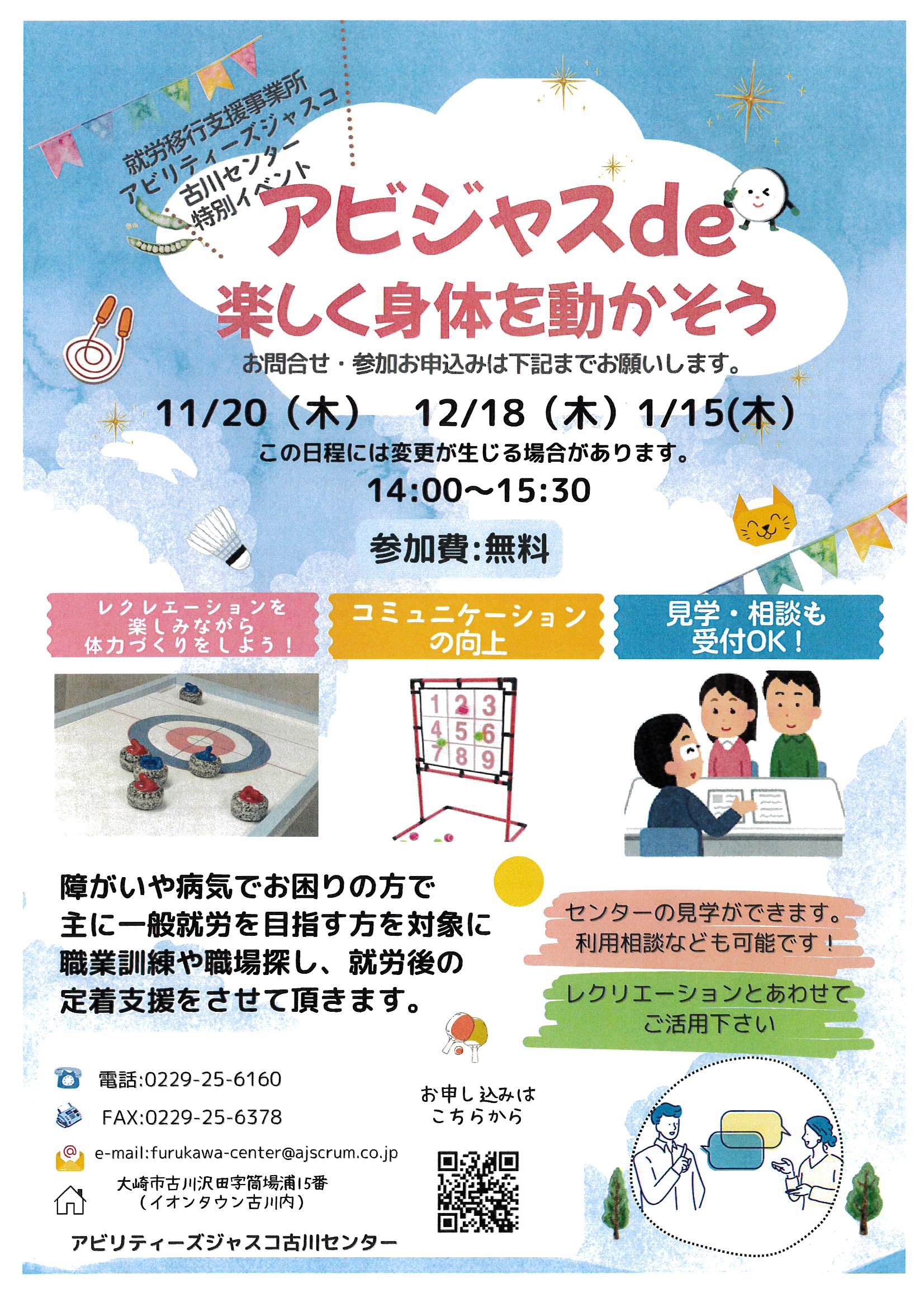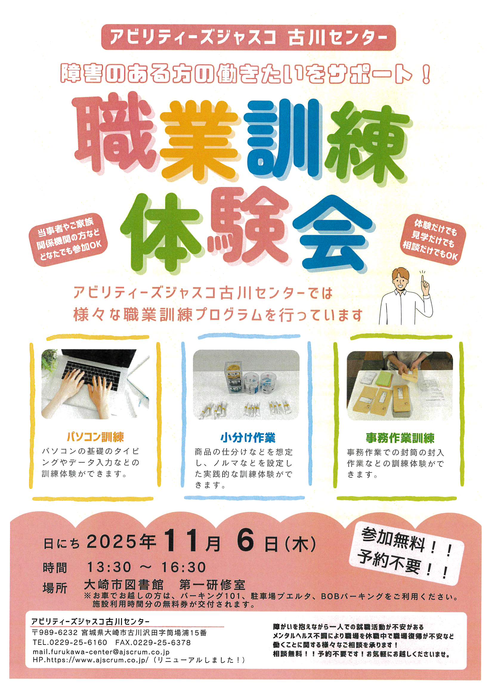 | その他 | 当日は当センターの施設見学や就労の相談も同時にできます! |