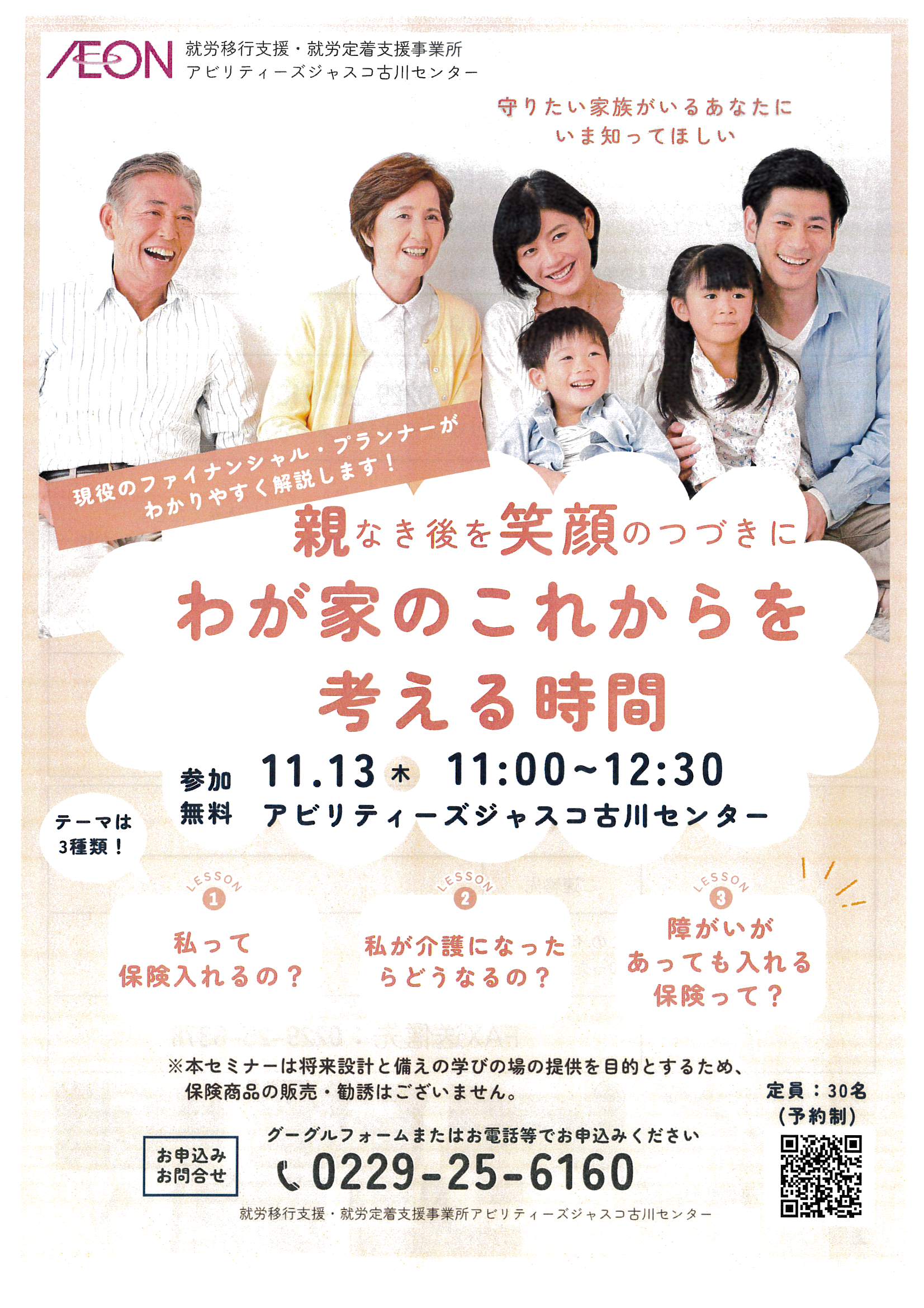 | その他 | テーマは3種類! LESSON1.私って保険入れるの? LESSON2.私が介護になったらどうなるの? LESSON3.障がいがあっても入れる保険って? 定員:30名 |