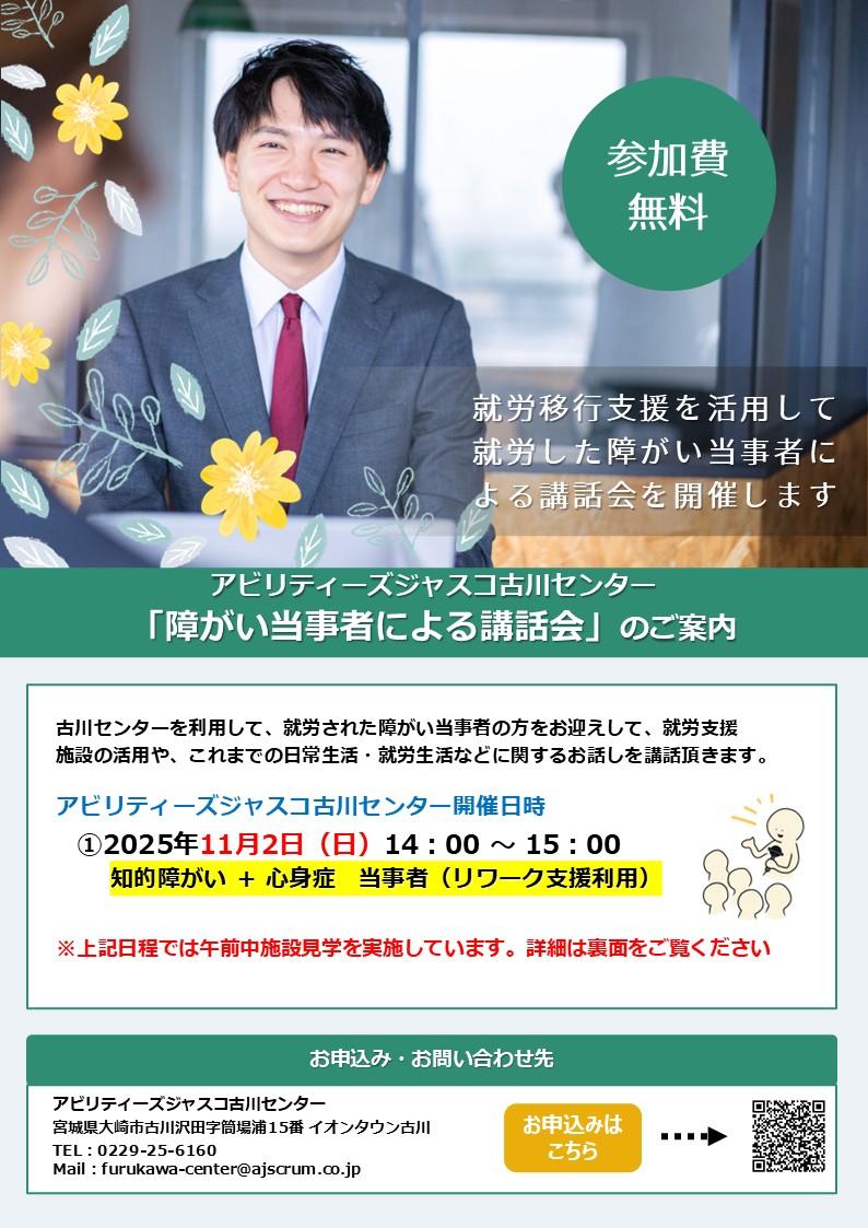 | その他 | 講話会の前後でセンターの見学や就労のご相談も承っております。 お気軽にお問い合わせくださいませ。 |