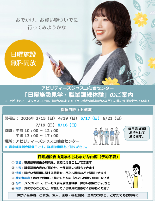| その他 | 日曜施設自由見学のおおまかな内容(予約不要) ① 環境:職業訓練施設の環境を、実際に見ることができます ② 内容:職業訓練内容のご紹介や、一部実際に体験もできます ③ 情報:障がい者雇用に関する情報を、パネル展示などで閲覧できます ④ 就労者の声:施設を利用して就労した方の「わたしの働く動画」を上映 ⑤ 配布:パンフレット、サービス満足度調査結果、障がい者啓発コラムなど ⑥ 相談:気になることなど、常駐している職員に遠慮なくお尋ねください |