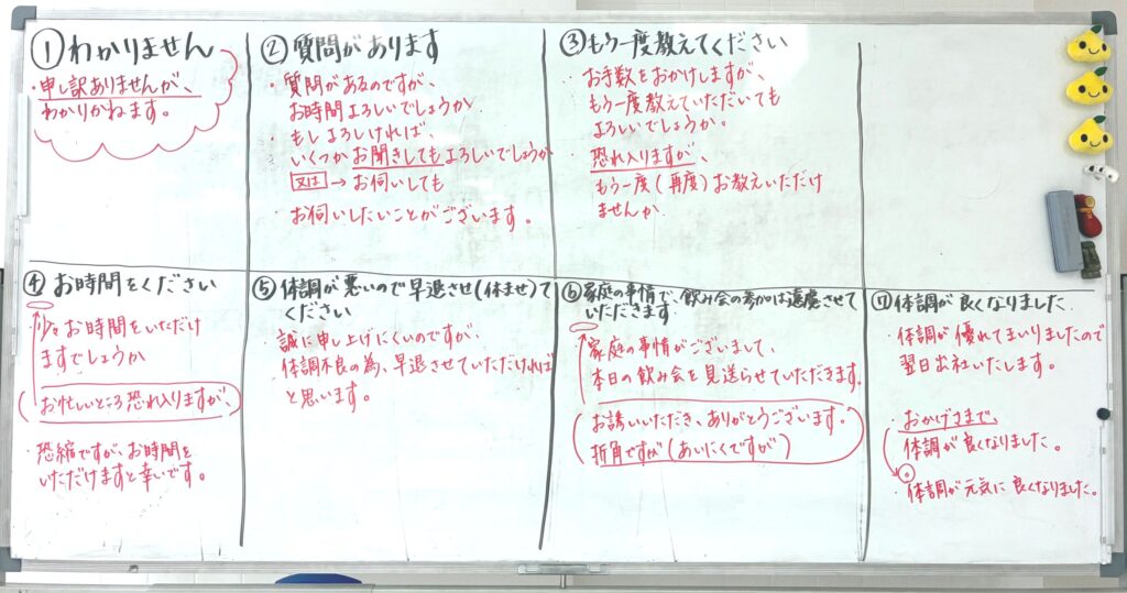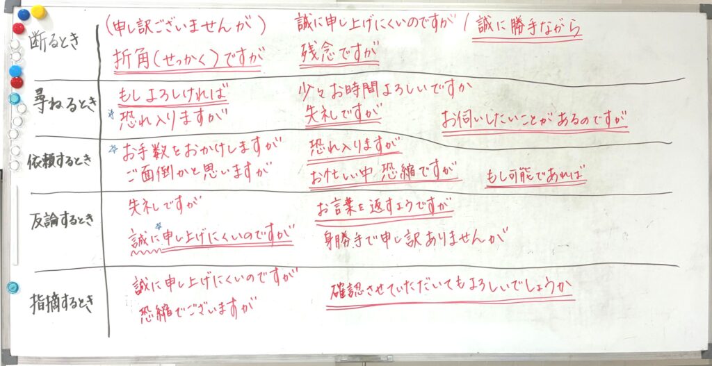 上記の画像は、それぞれのシーンにおいて、使える『クッション言葉』を