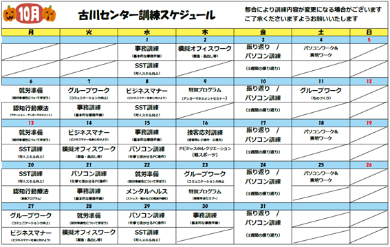 みなさま、こんにちは!古川センターです。10月の訓練スケジュールです。