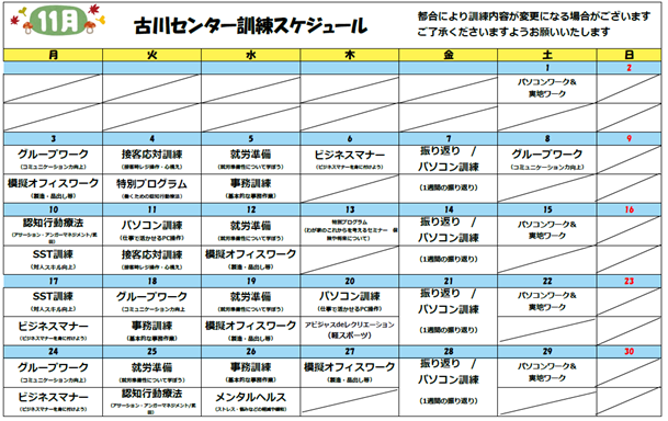 みなさま、こんにちは!古川センターです。11月の訓練スケジュールです。