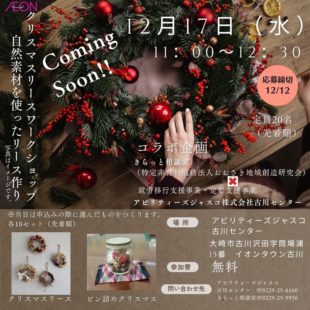 【古川】12月17日クリスマスリースワークショップ開催予定