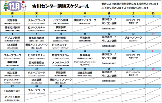 みなさま、こんにちは!古川センターです。12月の訓練スケジュールです。