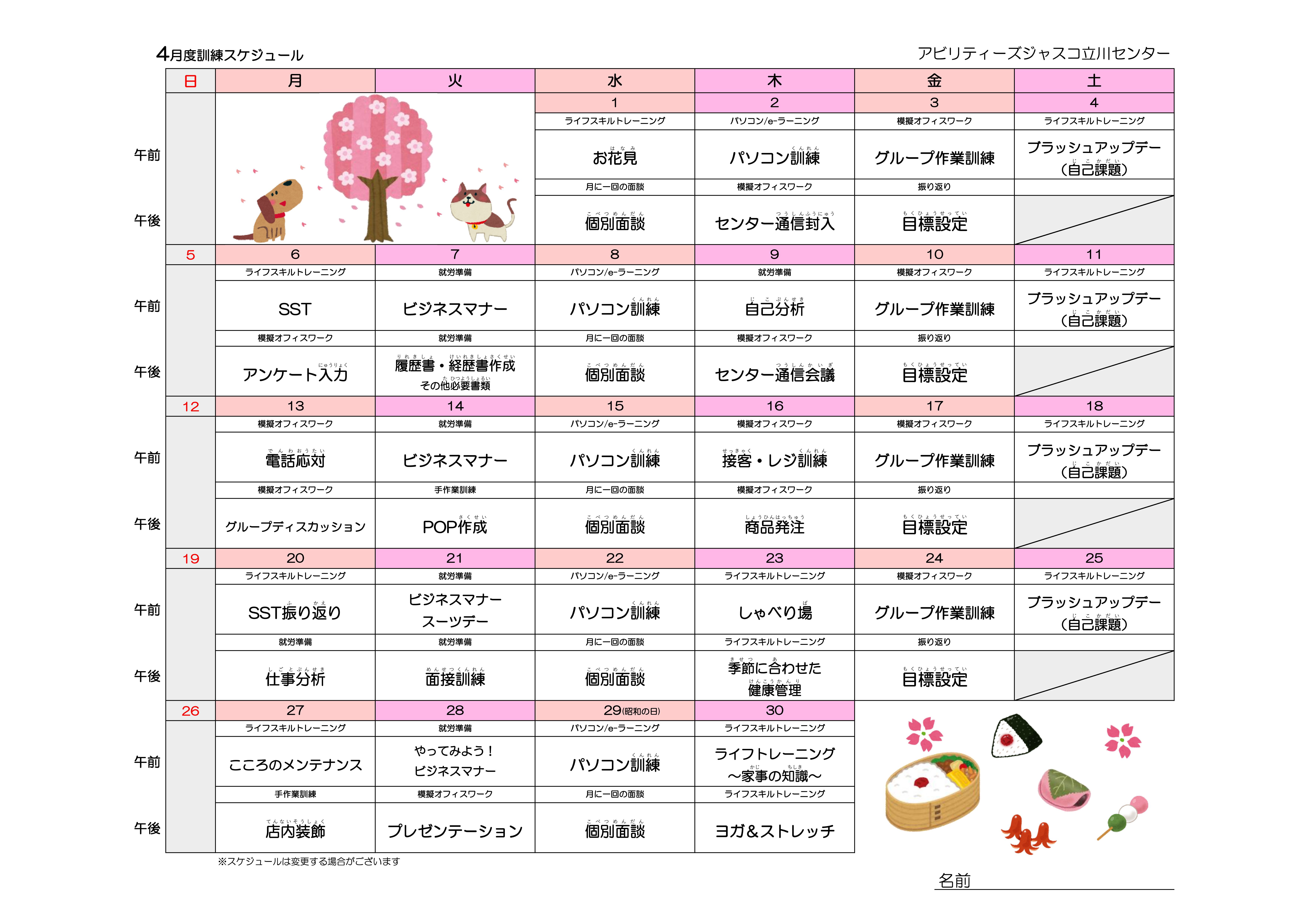 4月の訓練スケジュールを掲載します。